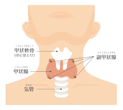 甲状腺は、喉仏のすぐ下に位置しており、蝶が羽を広げたような形状をしている内分泌器官です。甲状腺ホルモンを分泌する働きを担っています。